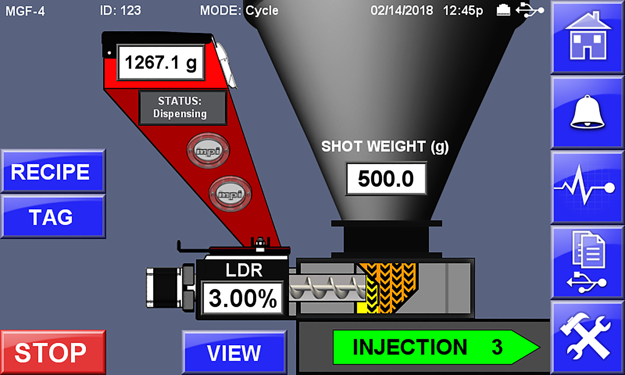 ????????與傳統(tǒng)喂料不同的是這種正在申請專利的控制系統(tǒng)可以在注塑階段同時(shí)計(jì)量加入色母,這使色母分散更均勻并節(jié)省成本。美鍇產(chǎn)品有限公司 (Maguire Products, Inc.) 在 K-2019 展上作為 MGF?重力喂料機(jī)的新功能介紹了該技術(shù)。在注塑成型周期中,大約 75% 的原料在回退階段進(jìn)入螺桿,大約 25% 在注塑期間進(jìn)入螺桿。由于傳統(tǒng)喂料機(jī)僅在回退過程中添加色母,因此可能會(huì)發(fā)生混合不足。當(dāng)注射量接近螺桿容量或最終產(chǎn)品為半透明時(shí),這尤其是個(gè)問題。在新的 100% Injection Coloring系統(tǒng)中,MGF?喂料機(jī)上的專用控制器在兩個(gè)階段都接收來自成型機(jī)的信號,從而確保在整個(gè)周期中都添加色母。