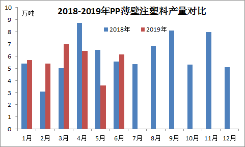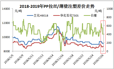 ????????從上圖可以看出,7月份,PP拉絲料/薄壁注塑料價差開始出現縮小趨勢。6月底7月初,薄壁注塑料和拉絲料價差在600元/噸左右,7月底,價差縮小至400元/噸,在利潤方面一直占有優勢的薄壁注塑料,開始逐漸走下神壇。