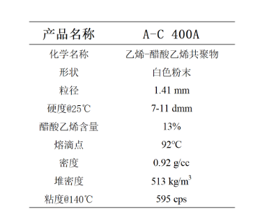 A-C 400A是有霍尼韋爾公司研發(fā)的一款乙烯-醋酸乙烯共聚蠟,擁有13%的游離醋酸乙烯含量。在塑料上可以作為很出色的分散劑,使得極性顏料、炭黑、填料能夠更好的在聚合物中分散開,在熱熔膠中能夠起到增加附著力和低溫降粘的作用。