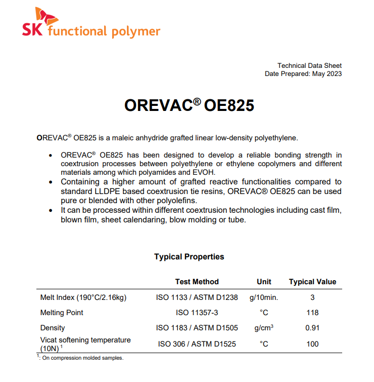- 法國阿科瑪 PEPA三層共擠 Orevac OE825 馬來酸酐改性粘合劑樹脂 物性表, 法國阿科瑪 PEPA三層共擠 Orevac OE825 馬來酸酐改性粘合劑樹脂 產品參數,法國阿科瑪 PEPA三層共擠 Orevac OE825 馬來酸酐改性粘合劑樹脂 性能表,法國阿科瑪 PEPA三層共擠 Orevac OE825 馬來酸酐改性粘合劑樹脂 出廠報告, MSDS,, 物質安全資料表, UL黃卡,{ SGS報告, RoHS, 食品級認證, NSF飲用水標準, 產品資料, 產品性能, 出廠報告, 原廠原包, 代理商, 熱變形溫度, 熔指數, 流動系數, 抗沖擊性能、沖擊強度, 低溫韌性、低溫抗沖擊性能, 熔體流動系數、熔體流動速率, 加工工藝、加工參數、加工溫度, 歐盟RoHS 德國FDA 美國FDA 日本FDA
