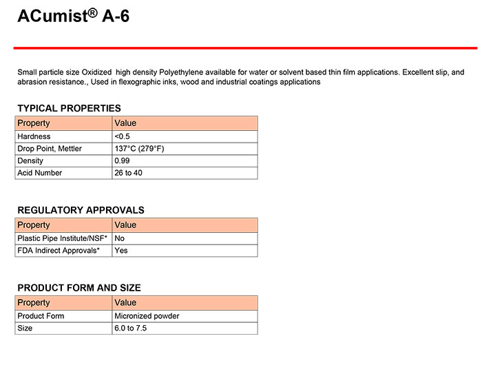- 霍尼韋爾蠟粉 ACumist A-6 微粉化氧化聚乙烯蠟 物性表, 霍尼韋爾蠟粉 ACumist A-6 微粉化氧化聚乙烯蠟 產(chǎn)品參數(shù),霍尼韋爾蠟粉 ACumist A-6 微粉化氧化聚乙烯蠟 性能表,霍尼韋爾蠟粉 ACumist A-6 微粉化氧化聚乙烯蠟 出廠報告, MSDS,, 物質(zhì)安全資料表, UL黃卡,{ SGS報告, RoHS, 食品級認(rèn)證, NSF飲用水標(biāo)準(zhǔn), 產(chǎn)品資料, 產(chǎn)品性能, 出廠報告, 原廠原包, 代理商, 熱變形溫度, 熔指數(shù), 流動系數(shù), 抗沖擊性能、沖擊強度, 低溫韌性、低溫抗沖擊性能, 熔體流動系數(shù)、熔體流動速率, 加工工藝、加工參數(shù)、加工溫度, 歐盟RoHS 德國FDA 美國FDA 日本FDA