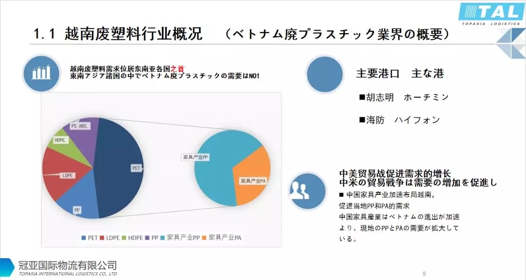 越南廢塑料需求位居?xùn)|南亞各國之首,再生塑料在越南的市場有PET,PP,PE,PS,ABS,PA。主要進(jìn)口港口:海防,胡志明。