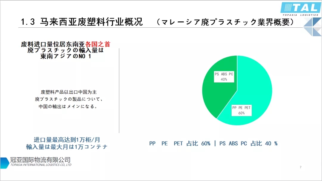 目前馬來西亞廢塑料進(jìn)口量是東南亞最大的。據(jù)海關(guān)統(tǒng)計(jì)每月有10000個(gè)集裝箱進(jìn)口。