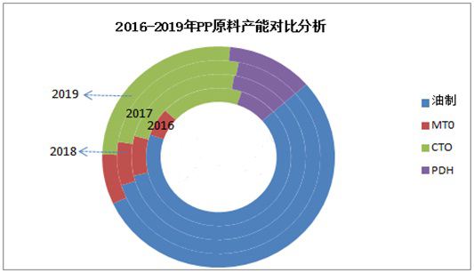 由2016-2019年PP原料產能對比分析發現,煤制烯烴產能增速最快,由2016年336萬噸增加到2019年633萬噸,增加297萬噸。其中2016年煤制烯烴產能占比18%,2019年煤制烯烴產能占比已經高達26%,占比增加8%,其增速令人驚訝。另外PDH系列也是增速較快產品,由于丙烷脫氫產品因成本優勢明顯,后期擴能產品也將呈現新得突破。原料多元化,市場競爭壓力也將逐步升級。
