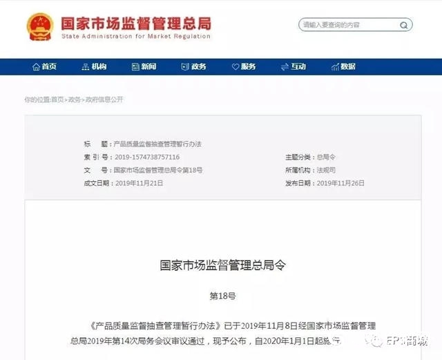 11月26日,國家市場(chǎng)監(jiān)督管理總局發(fā)布《產(chǎn)品質(zhì)量監(jiān)督抽查管理暫行辦法》,將自2020年1月1日起施行。《辦法》共56條,明確了監(jiān)督抽查的組織、抽樣、檢驗(yàn)、異議處理、結(jié)果處理及相關(guān)人員應(yīng)承擔(dān)的法律責(zé)任,對(duì)于加強(qiáng)產(chǎn)品質(zhì)量監(jiān)督管理、規(guī)范產(chǎn)品質(zhì)量監(jiān)督抽查工作、保護(hù)消費(fèi)者的合法權(quán)益有重要意義。