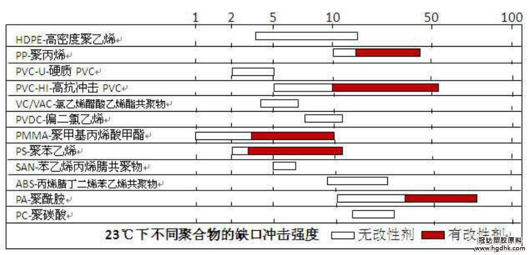 從上圖可見 PA 的抗沖擊性能最好;其次是 PC。PP、PVC-HI、PMMA、PS、PA 添加沖擊改性劑后,抗沖擊性能大大提高。ABS、PA、PC 即使不加抗充擊改性劑 的抗沖擊性能也較大。其中 PMMA 和 PC 都是透明材料,PMMA 的剛性好,脆;PC 的韌性好,不脆。無改性劑的 PS 抗沖擊性能較差,我們曾經為客戶測試過加入改 性劑的 PS 產品,抗沖擊性能提高許多。 沖擊改性劑的品種很多,常用的有 ACR-丙烯酸酯類樹脂、MBS-甲基丙烯酸甲酯-丁二烯-苯乙烯共聚物、CPE-氯化聚乙烯、ABS、EVA、EPT-三元乙丙膠等。 從制品的改性效果來看,ACR 是綜合性能最好的一類,MBS 是透明制品重要的沖擊改性劑,在全球沖擊改性劑市場中占有重要地位。