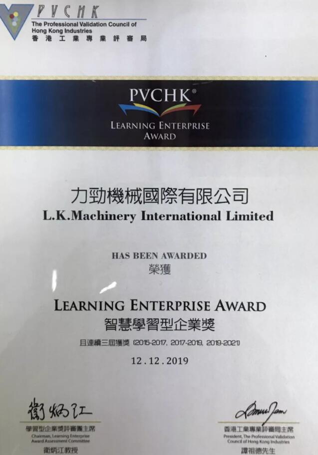 ????????經過自我評估、評審專員初評和獨立終審委員會專家的最終客觀審定,力勁集團在“資源投入推動人才培訓”、“系統化管理人才發展”、“資訊科技應用”、“策略運用”、“企業文化”五個標準、五十項細節方面達到評審標準,榮獲“2019智慧學習型企業獎”。力勁集團CEO劉卓銘先生、董事會主席張俏英女士出席頒獎典禮。