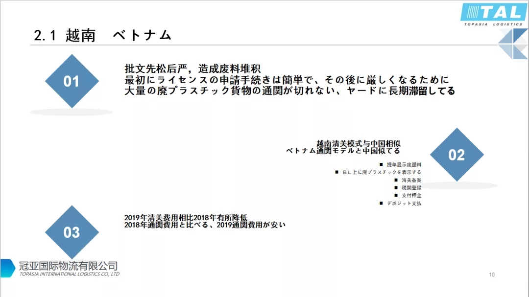 ????????有批文的還是可以正常清關,通關時間也很迅速。越南廢料的清關模式跟之前中國很像,提單必須顯示廢塑料,收貨人需要在海關備案,進口報關的時間需要支付押金。現在問題是只有少數幾家船公司愿意接去越南的貨。相比2018年的情況,2019年下半年陸續出來很多新的批文,清關費用也在逐步降低。