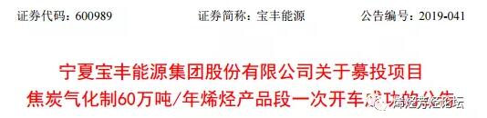 ????????公告顯示,焦炭氣化制60萬噸/年烯烴項目是寶豐能源首發(fā)上市募集資金投資項目,項目總投資金額達152.79億元。該項目主要分為兩段:前段焦炭氣化制220萬噸/年甲醇項目,后段甲醇制60萬噸/年聚烯烴項目,以及相關(guān)配套公用工程,預(yù)計將于2019年底前全部建成投產(chǎn)。