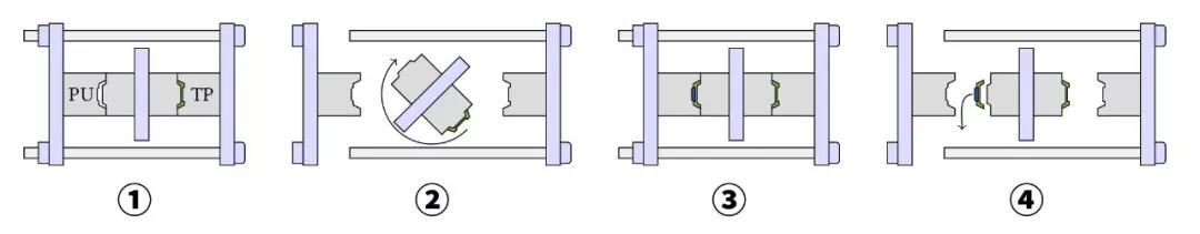 ????????2 . 旋轉(zhuǎn)單元旋轉(zhuǎn)。熱塑性塑料基體現(xiàn)在位于左腔(PU腔)中。