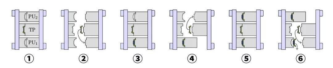 ????????圖1顯示了用于注塑成型與聚氨酯包覆成型的組合技術的傳統(tǒng)模具技術。首先,注入熱塑性塑料基體,旋轉(zhuǎn)裝置將基體帶入聚氨酯模具中。在下一個循環(huán)中,基體用聚氨酯包覆成型,同時在注塑模具中生產(chǎn)新的熱塑性基體。熱塑性基體的成型周期和聚氨酯涂層的反應時間是相關的。