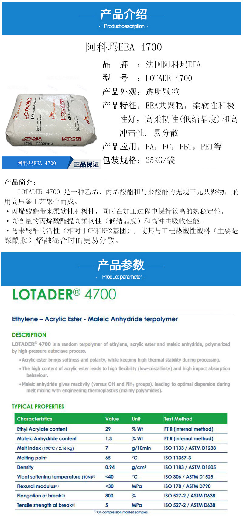 - 如果您對我們的Lotader EEA 法國阿科瑪 4700 MAH 三元共聚物 高抗沖 熱穩(wěn)定性有任何疑問,或者想索取Lotader EEA 法國阿科瑪 4700 MAH 三元共聚物 高抗沖 熱穩(wěn)定性物性表datasheet、物質(zhì)安全資料證書MSDS、ROHS檢驗(yàn)報告、SGS報告、REACH環(huán)保證明、FDA證明、EU法規(guī)證明、UL證書及出廠證明COC/COA報告等,敬請撥打我們的服務(wù)熱線 19279864570,或者點(diǎn)擊 聯(lián)系我們 給我們留言。