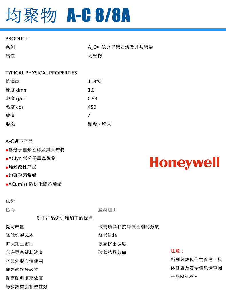 - Honeywell霍尼韋爾 A-C 8A 蠟粉 物性表, Honeywell霍尼韋爾 A-C 8A 蠟粉 產品參數,Honeywell霍尼韋爾 A-C 8A 蠟粉 性能表,Honeywell霍尼韋爾 A-C 8A 蠟粉 出廠報告, MSDS,, 物質安全資料表, UL黃卡,{ SGS報告, RoHS, 食品級認證, NSF飲用水標準, 產品資料, 產品性能, 出廠報告, 原廠原包, 代理商, 熱變形溫度, 熔指數, 流動系數, 抗沖擊性能、沖擊強度, 低溫韌性、低溫抗沖擊性能, 熔體流動系數、熔體流動速率, 加工工藝、加工參數、加工溫度, 歐盟RoHS 德國FDA 美國FDA 日本FDA