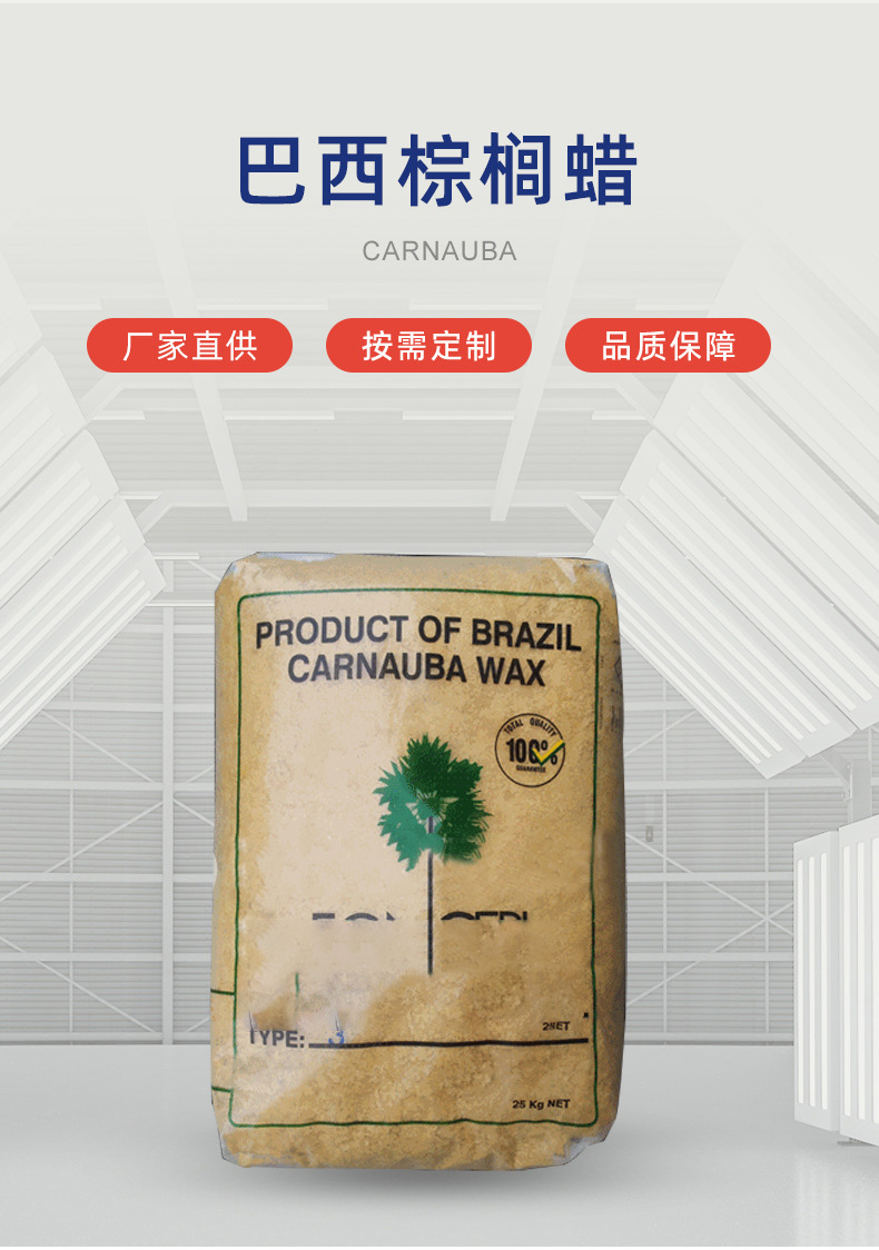 巴西棕櫚蠟質地非常堅硬,具有極高的光澤,極易乳化,有著良好的保油性,它最大的優點是具有其它蠟所沒有的光澤度和硬度。此外,它具有的拋光特性使其成為皮革等行業上不可或缺的原料。可應用于制造復寫紙。棕櫚蠟稀薄而黏滯度小,樹脂含量低,涂布均勻,流動性能好,制成的復寫紙性能好。也巴西棕櫚蠟可用于地板蠟和鞋油,具有光澤好、光潔度高、表面沒有油膩的優點。還可用于橡膠防老劑,同時具有一定的軟化與潤滑作用,使膠料易脫模和壓出,使成品外觀平整。