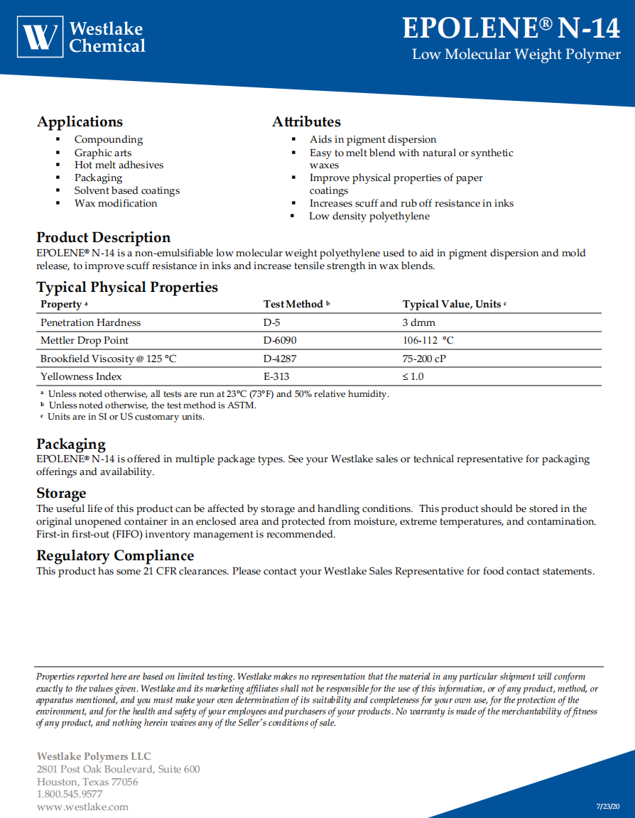 - 美國西湖化學WESTLAKEN14 聚乙烯蠟 N-14 物性表, 美國西湖化學WESTLAKEN14 聚乙烯蠟 N-14 產品參數,美國西湖化學WESTLAKEN14 聚乙烯蠟 N-14 性能表,美國西湖化學WESTLAKEN14 聚乙烯蠟 N-14 出廠報告, MSDS,, 物質安全資料表, UL黃卡,{ SGS報告, RoHS, 食品級認證, NSF飲用水標準, 產品資料, 產品性能, 出廠報告, 原廠原包, 代理商, 熱變形溫度, 熔指數, 流動系數, 抗沖擊性能、沖擊強度, 低溫韌性、低溫抗沖擊性能, 熔體流動系數、熔體流動速率, 加工工藝、加工參數、加工溫度, 歐盟RoHS 德國FDA 美國FDA 日本FDA