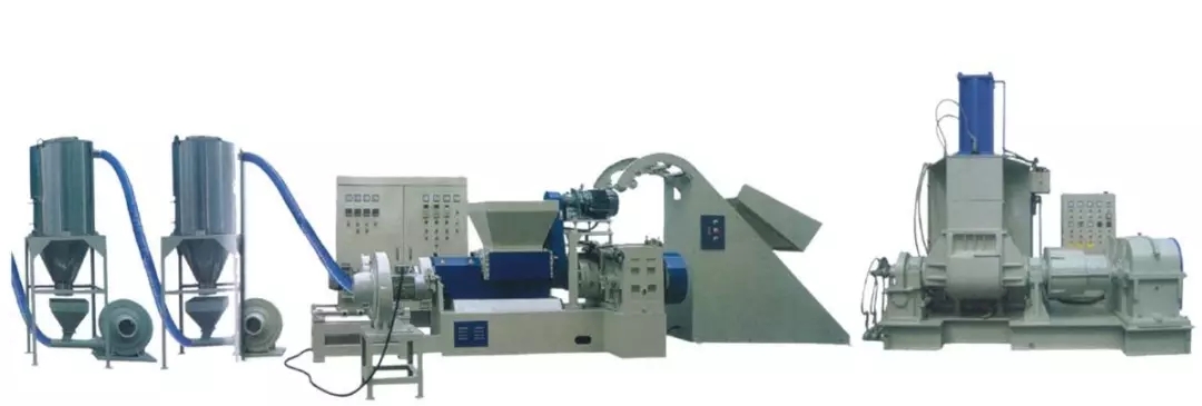 ????????輔機主要包括:風(fēng)冷拉條機頭,風(fēng)冷輸送帶,切粒機,振動篩,成品料倉等。